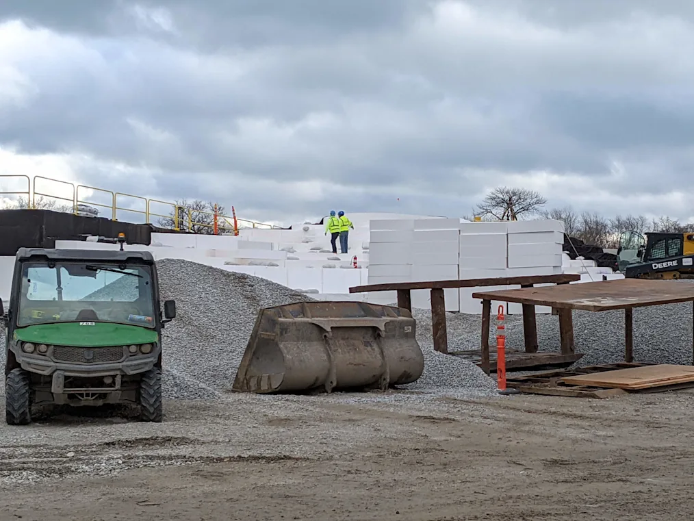 Workers wearing bright safety vests walk and blue hard hats as they walk on large white blocks of geofoam that will form the base of the playground and great lawn. In the foreground, large metal construction implements are strewn about and a green and white golf cart sits to one side.
