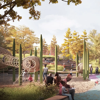 A rendering of people of all ages and skin tones gathering at several picnic tables on the John Lewis Plaza at the Obama Presidential Center.