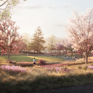 A rendering of a movie being shown on the Great Lawn at the Obama Presidential Center. Hundreds of people of all ages and skin tones gather and sit on the grass.